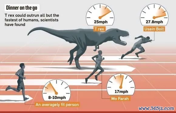 那么东谈主类中长跑的速率是些许呢?现时四百米的寰宇记录是43秒,时速约33公里,低于霸王龙的速率上限。因此,在400米的比赛中东谈主类很难跑赢霸王龙……