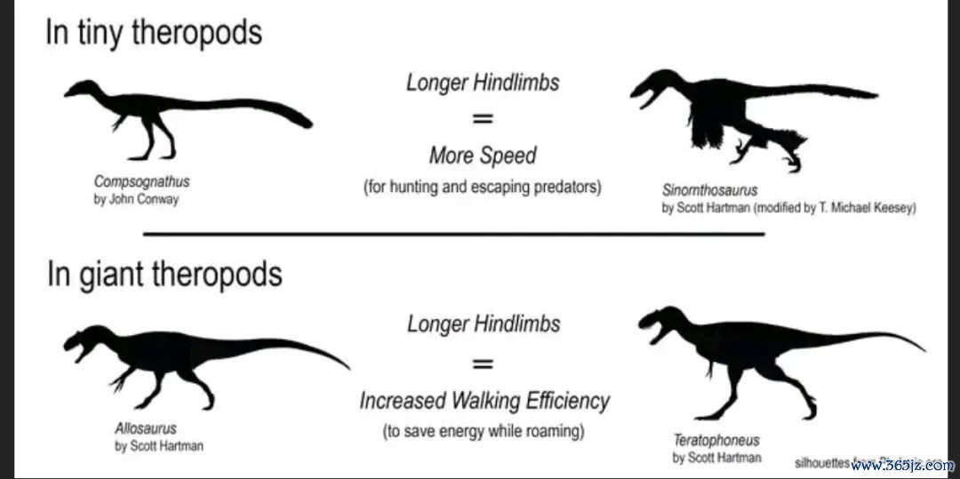 2020年的一项策划表现,微型肉食恐龙(如好意思颌龙和中国鸟龙)腿越长速率越快;而大型肉食恐龙(如异特龙和怪猎龙)腿越长则耐力更强。