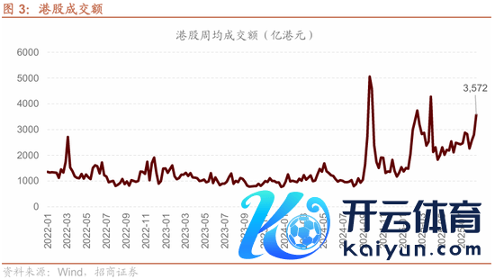 上周港股日均成交额3572亿港元,环比加多769亿,处于近三年97.4%分位数。