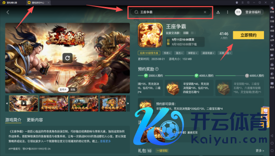 第二步,投入雷电游戏中心,搜索“王座争霸”进行预约。游戏上线后点击投入该游戏主页即可下载安设王座争霸电脑版。