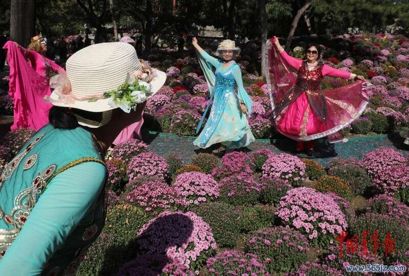 9月30日,北京日坛公园,市民穿戴跳舞上演服装在花丛中拍照。中青报·中青网记者 陈剑/摄